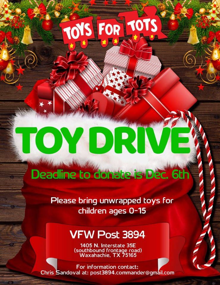 VFW Post 3894 is now accepting applications for the 2025 Toys for Tots Distribution. To qualify the family must be residents of Ellis County. You can only apply to one location for toys. Please send an email requesting an application to the following, post3894.commander@gmail.com. We will send you the application with instructions. All applications must be submitted by November 30th, 2025.